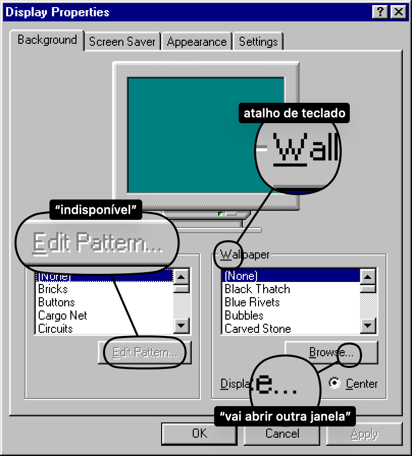 A interface do Windows 95 estabeleceu uma linguagem visual que uma geração inteira internalizou sem perceber. Botões tinham relevos e sombras, para parecerem objetos que se podia apertar. Controles desabilitados ficavam acinzentados. Itens de menu com reticências indicavam que uma caixa de diálogo estava por vir; itens sem reticências executavam a ação imediatamente. Letras sublinhadas em cada rótulo indicavam o atalho de teclado. Os affordances estavam por toda parte, consistentes e autodocumentados.